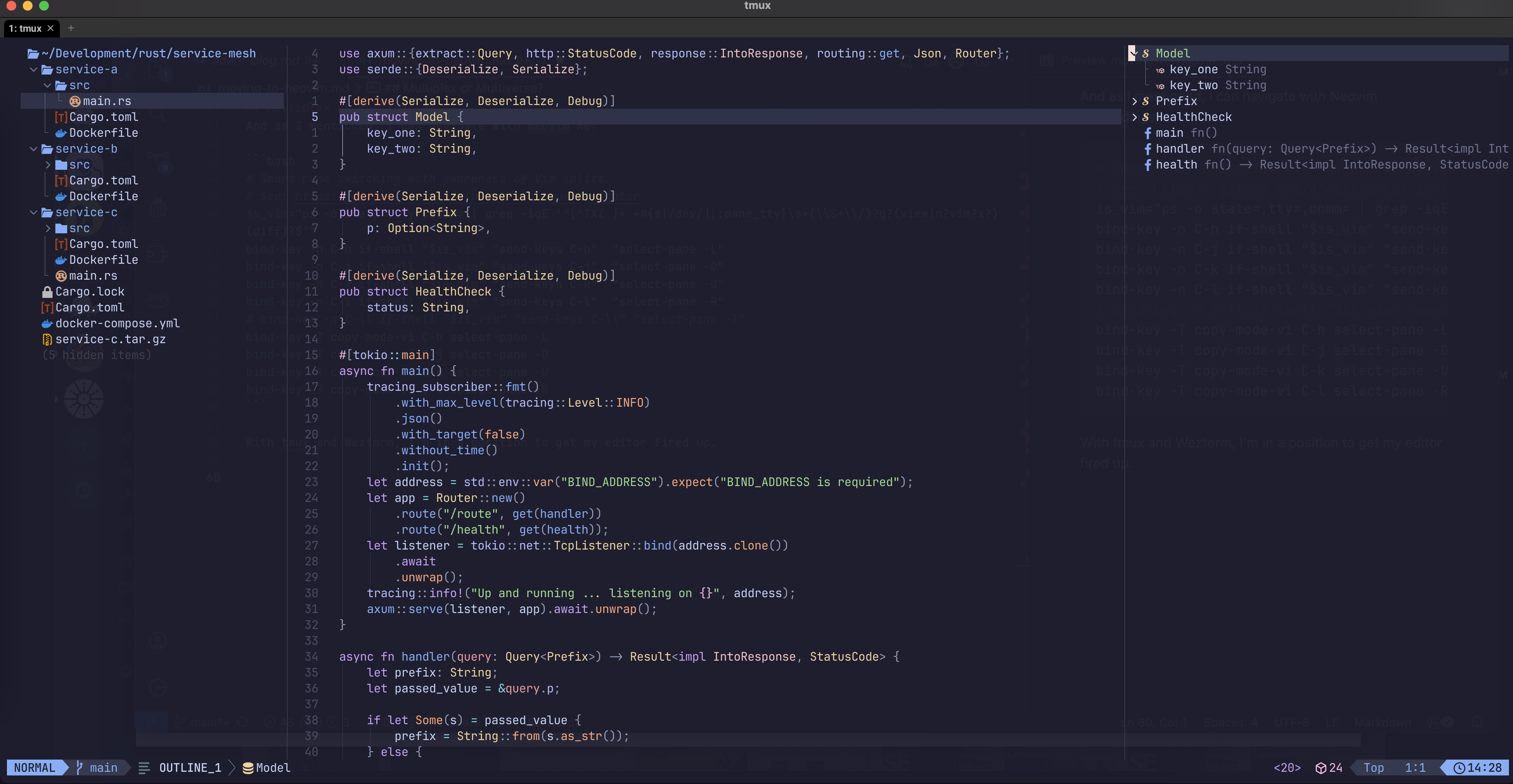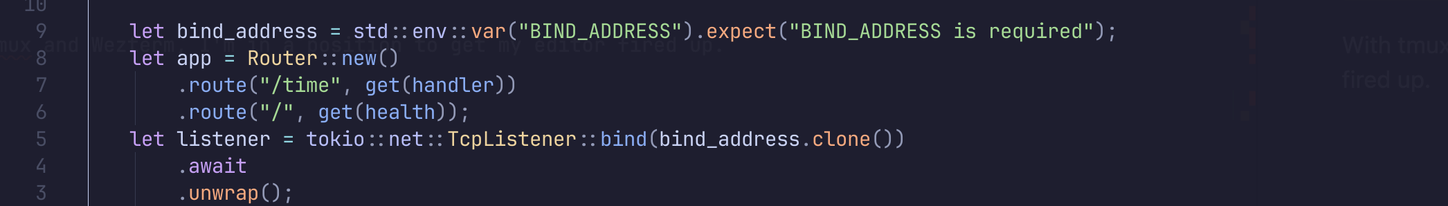 With tmux and Wezterm, I’m in a position to get my editor fired up.
