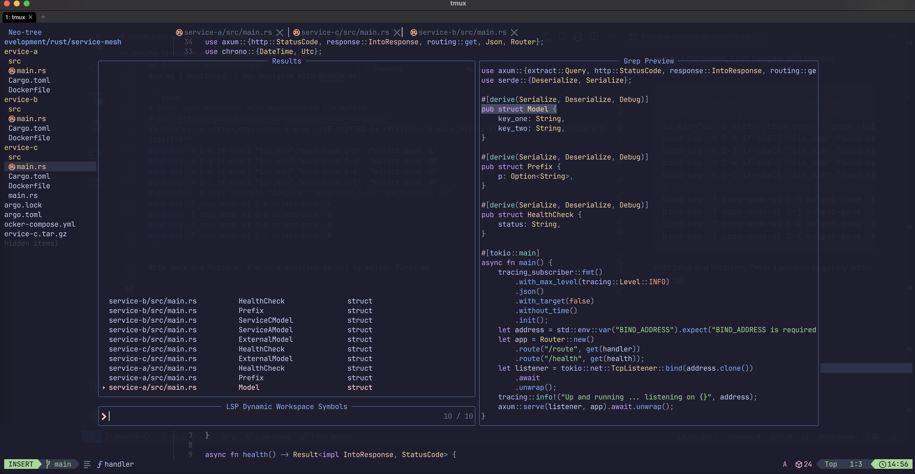 I don’t think many Neovim users could live without Telescope. Maintained by TJ DeVries, this is a fuzzy find, LSP integrator, and so many other things. I use it constantly to find open buffers, grep my codebase, look through Git logs, and pull up references. The image below shows how I’m using it to find Workspace Symbols.