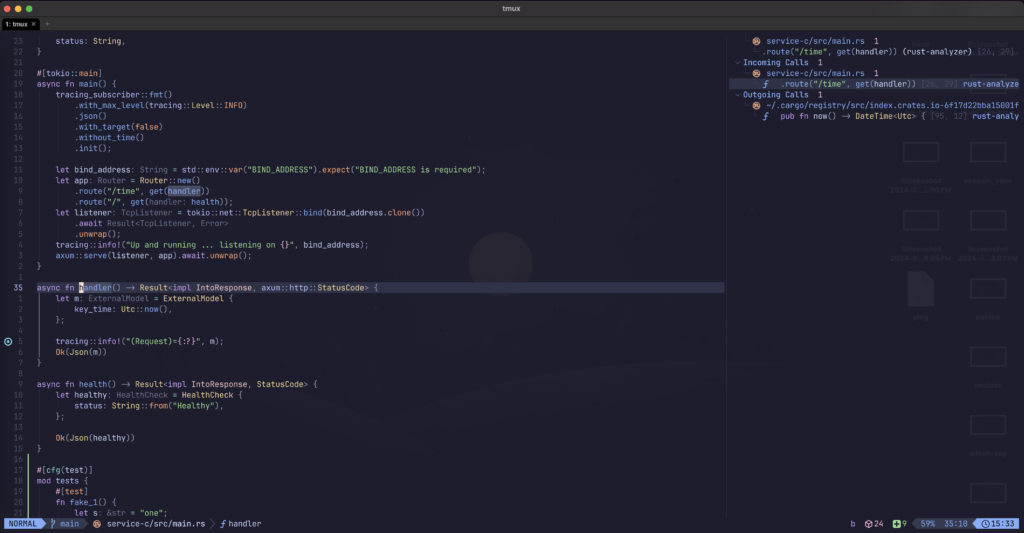 - Simplification of my tooling. I need a Terminal Emulator and Neovim. With that setup, I can work on Rust, Go, TypeScript, HTML, YAML, and any language or markup that I encounter in my day-to-day job. No VSCode for this and Jetbrains for that. No switching between keybindings and the mouse. Now, I do have many plugins that enhance my Neovim experience, but at its core, my setup is 2 things.